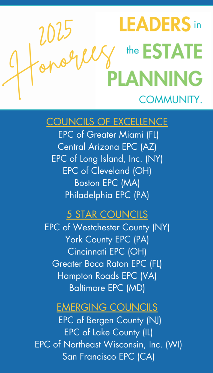 Created in 2014, the National Association of Estate Planners & Councils Leonard H. Neiman & Walter Lee Davis, Jr. Council of Excellence Award recognizes councils that are successful in their efforts to provide a strong multi-disciplinary council for their members. Created by a group of council leaders, past presidents of NAEPC, and current Board and Council Relations Committee members, with all council sizes in mind, the Council of Excellence Award is intended to honor those councils that truly work to grow their programs and services and provide an exceptional member experience.